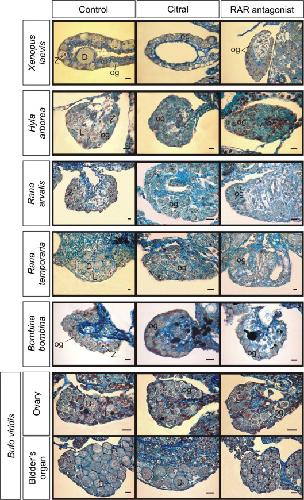 Retinoic acid homeostasis regulates meiotic entry in developing anuran gonads and in Bidder's organ through Raldh2 and Cyp26b1 proteins.