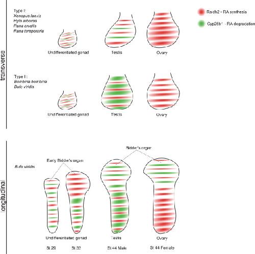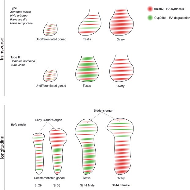 Fig. 7. Scheme of the Raldh2 and Cyp26b1 relations in the developing anuran gonads (transverse section) as well as in the Bidderâs organ and gonads of B. viridis (longitudinal section).