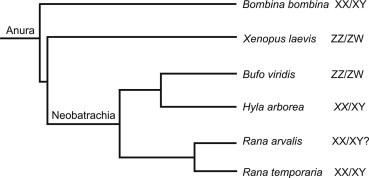 Fig. 1. Phylogenic tree of studied anuran species and their sex chromosome status (on the basis of Schmid and Steinlein, 2001 and Roelants et al., 2007).
