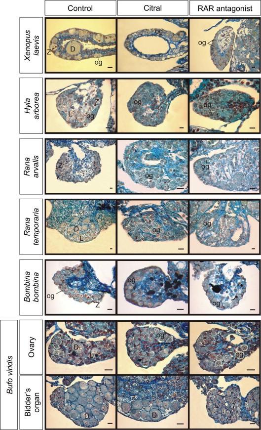 Fig. 4. Effects of citral and RAR antagonist (BMS453) on the ovaries of anuran amphibians including Bidderâs organs in Bufo viridis. In the control ovaries oogonia (og) as well as meiocytes at phases of leptotene (L), zygotene/pachytene (Z) as well as diplotene oocytes (D) were present. In the ovaries after 20-days culture with citral or RAR antagonist, only oogonia (og) were present and no meiocytes were visible. The control Bidderâs organs were filled with numerous diplotene oocytes (D), however, in the Bidderâs organs after 20-days treatment with citral or RAR antagonist the number of diplotene oocytes were lowered or only leptotene and zygotene/pachytene oocytes were present. Scale bar 25 μm.