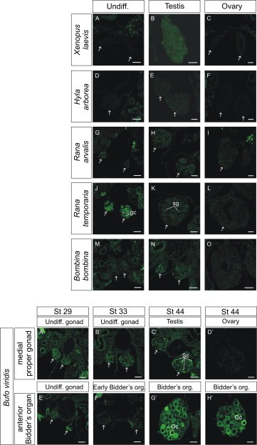 Fig. 6. The immunolocalization of Cyp26b1 in the developing gonads of anuran amphibians. (A) The undifferentiated gonads (arrows) of X. laevis â the lack of Cyp26b1 stain. (B) The testis (arrows) â weak signal of Cyp26b1. (C) The ovaries (arrows) of X. laevis at â the absence of Cyp26b1 signal. (D) The undifferentiated gonads of H. arborea â The lack of Cyp26b1. (E) The testis of H. arborea in which slight signal of Cyp26b1 was observed. (F) The ovaries of H. arborea with the absence of Cyp26b1. (G) The undifferentiated gonads and adjacent tissues of R. arvalis. A slight signal of Cyp26b1 was seen in the nuclei of the germ cells. (H) The testes of R. arvalis â Cyp26b1 was almost undetectable. (I) The ovary of R. arvalis â Cyp26b1 â the absence of Cyp26b1. (J) The undifferentiated gonads of R. temporaria. The Cyp26b1 signal was evident in the germ cells (gc). (K) The testis of R. temporaria â a slight signal of Cyp26b1 was visible in the spermatogonia (sg). (L) The ovaries of R. temporaria with a low signal of Cyp26b1 in the germ cells. (M) The undifferentiated gonads and adjacent tissues of B. bombina â a slight signal of Cyp26b1 was seen. (N) In the testes tissues of B. bombina Cyp26b1 was visible in the somatic cells (presumably Sertoli cells) enclosing the germ cells. (O) The ovary tissues of B. bombina was characterized by the lack of Cyp26b1. (Aâ²) The genital ridge (arrows) of B. viridis at the medial section (arrows) of B. viridis at Gosner stage 29. Cyp26b1 signal was strong especially in the somatic cells. (Bâ²) The undifferentiated gonad of B. viridis in the medial part at Gosner stage 33. (Câ²) The testes (arrows) of B. viridis at the Gosner stage 44 - the Cyp26b1 was expressed in the somatic cells (Sertoli cells, Sc) enclosing germ cells. (Dâ²) The ovary of B. viridis at the Gosner stage 44 â the lack of Cyp26b1. (Eâ²) The genital ridge at the anterior part (future Bidderâs organ) â Cyp26b1 was observed. (Fâ²) The beginning of the Bidderâs organ formation of B. viridis at Gosner stage 33 â the signal of Cyp26b1 was almost ceased. (Gâ²) The later Bidderâs organ (arrows) of the B. viridis male at Gosner stage 44 â Cyp26b1 signal was strong in the cytoplasm of the oocytes (Oc). (Hâ²) The Bidderâs organ of the B. viridis female was similar to this organ in a male. Scale bar 40 μm.
