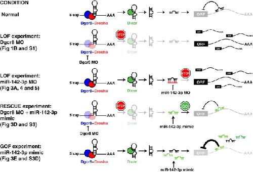 Schematic diagram summarizing the different approaches used to show that miR-142-3p is necessary and sufficient for hemangioblast specification during establishment of the HSC lineage. A combination of loss-of-function (LOF), gain-of-function (GOF), and rescue experiments were used to investigate whether miR-142-3p controls definitive hemangioblast specification.