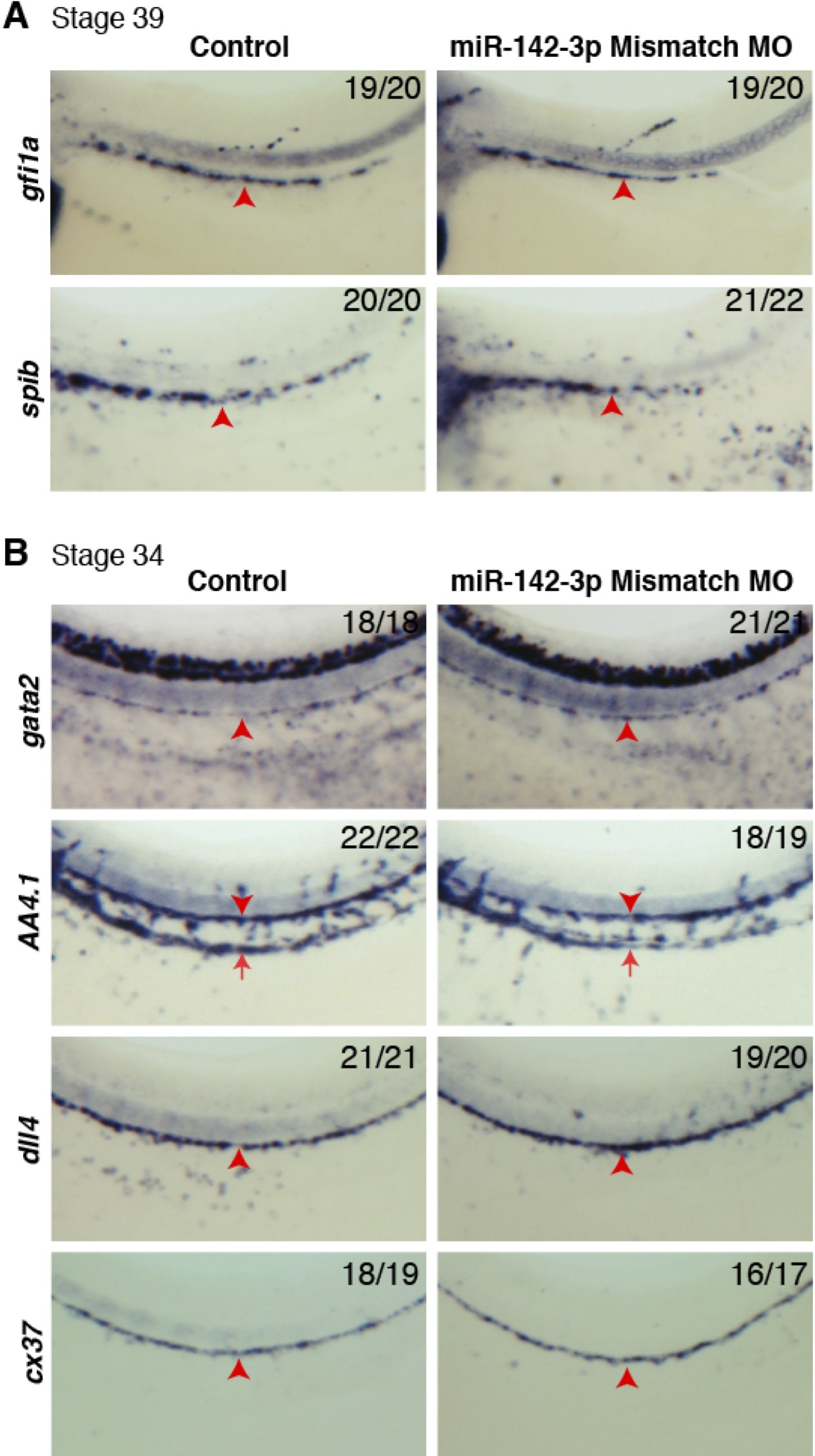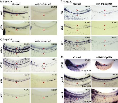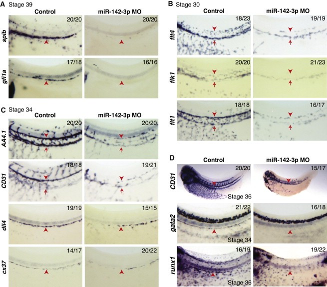 (C) Defective expression of endothelial markers in miR-142-3p morphants. WISH analysis of AA4.1, CD31, dll4, and cx37 in the DA (arrowhead) and PCV (arrows) at stage 34.