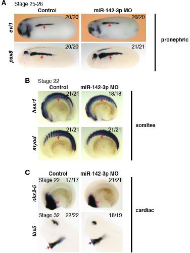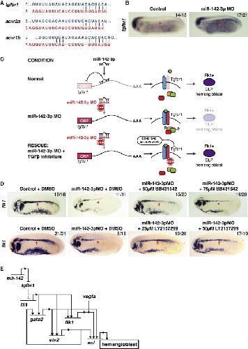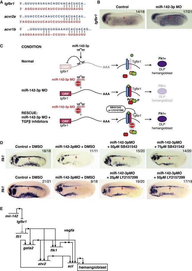 (B) WISH analysis at stages 25â26 showing that tgfbr1 expression is elevated in the DLP region (arrows) in miR-142-3p morphants.