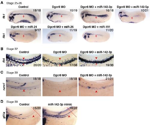 (D) Rescue experiment: Coinjection of the miR-142-3p mimic is sufficient to restore hemangioblast formation in dgcr8 morphants. Expression of flk1 (top) and scl (bottom) in the DLP (arrows) analyzed by WISH at stages 24â25.