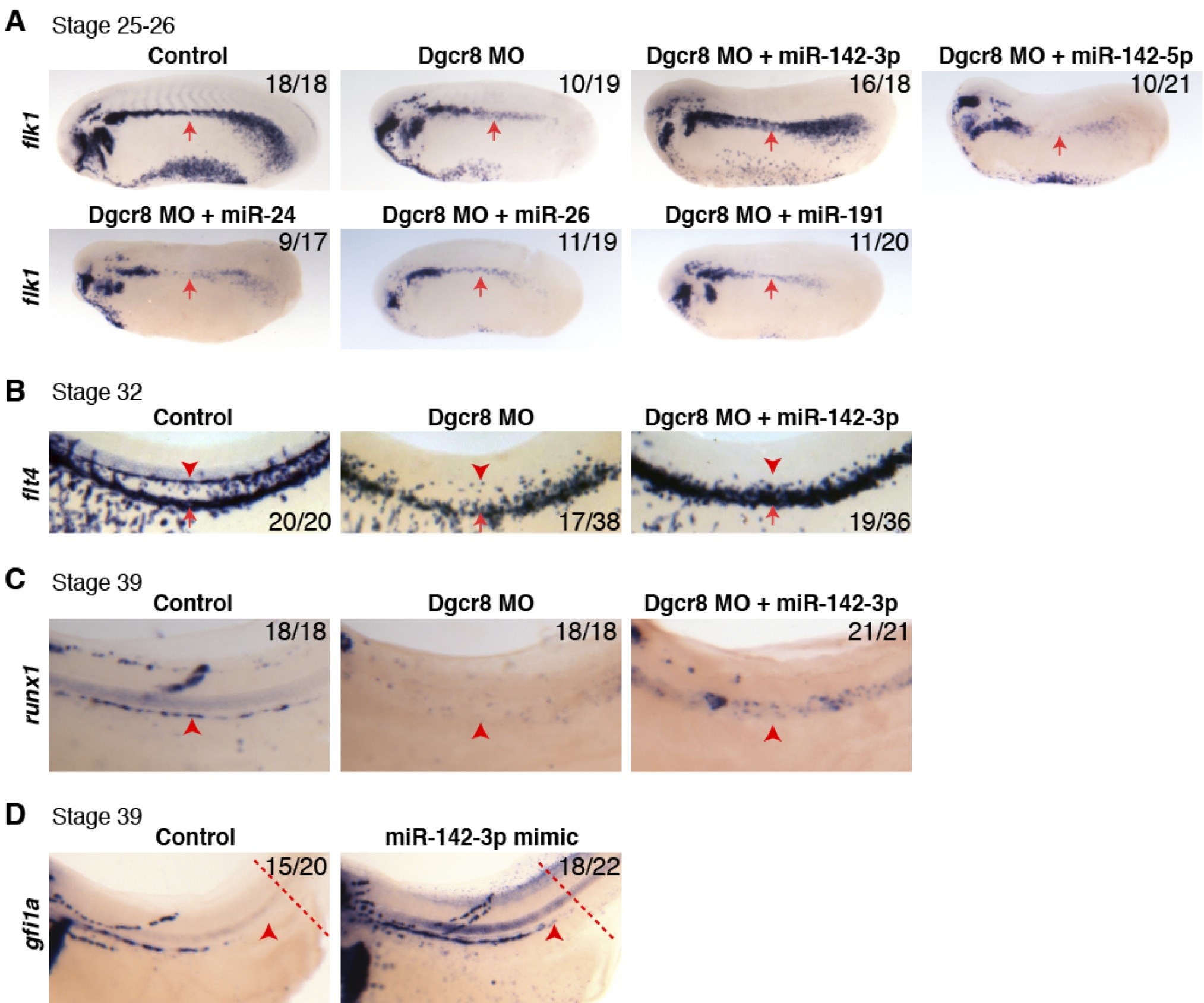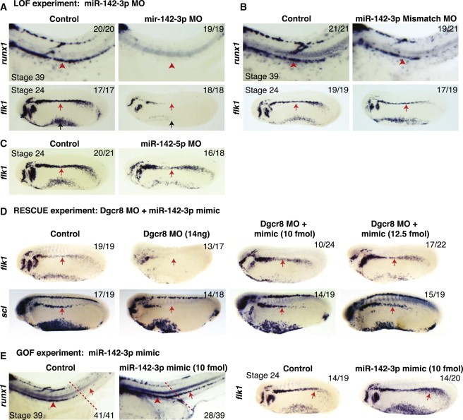 (AâC) LOF experiment: miR-142-3p is required for formation of hemogenic endothelium and for hemangioblast specification in the DLP. Embryos injected with 100 ng miR-142-3p MO (A), but not a mismatch control MO (B), phenocopy hematopoietic defects of Dgcr8 MO embryos. Top: WISH showing runx1 expression in hemogenic endothelium (arrowheads) at stage 39. Bottom: WISH showing flk1 expression in DLP hemangioblasts (red arrows) at stage 24. Endothelial cells in VBI are indicated by black arrows. (C) WISH showing flk1 expression is normal in the DLP (arrows) at stage 24 in miR-142-5p (passenger strand) morphants.