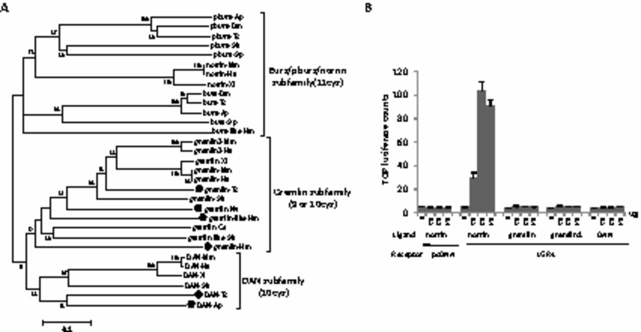 Mammalian LGR4, 5 and 6 are seven-transmembrane receptors that are important for diverse physiological processes. These receptors are orthologous to DLGR2, a Drosophila receptor activated by the burs/pburs heterodimer important for morphogenesis. Although recent studies indicated that four R-spondin proteins are cognate ligands for LGR4, 5 and 6 receptors, several BMP antagonists in vertebrates have been postulated to be orthologous to burs and pburs. Using newly available genome sequences, we showed that norrin is a vertebrate ortholog for insect burs and pburs and stimulates Wnt signaling mediated by LGR4, but not by LGR5 and 6, in mammalian cells. Although norrin could only activate LGR4, binding studies suggested interactions between norrin and LGR4, 5 and 6. Norrin, the Norrie disease gene product, is also capable of activating Wnt signaling mediated by the Frizzled4 receptor and serves as a BMP antagonist. Mutagenesis studies indicated that different norrin mutations found in patients with Norrie disease can be categorized into subgroups according to defects for signaling through the three distinct binding proteins. Thus, norrin is a rare ligand capable of binding three receptors/binding proteins that are important for BMP and Wnt signaling pathways.