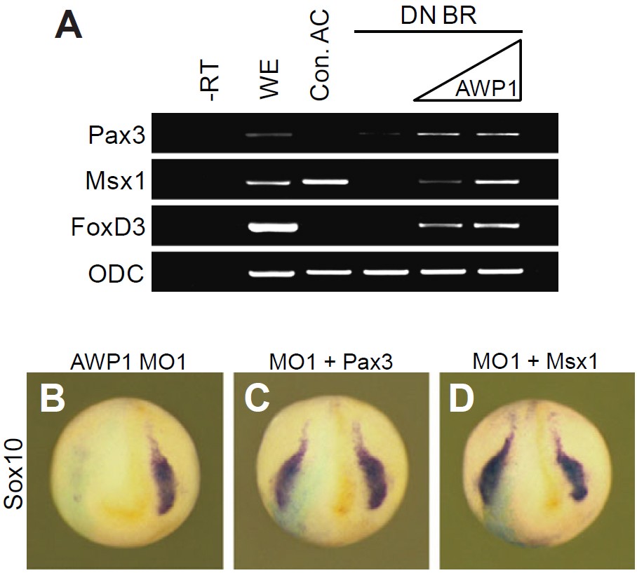 Fig. 4. XAWP1 regulates neural crest induction upstream of Msx1 and