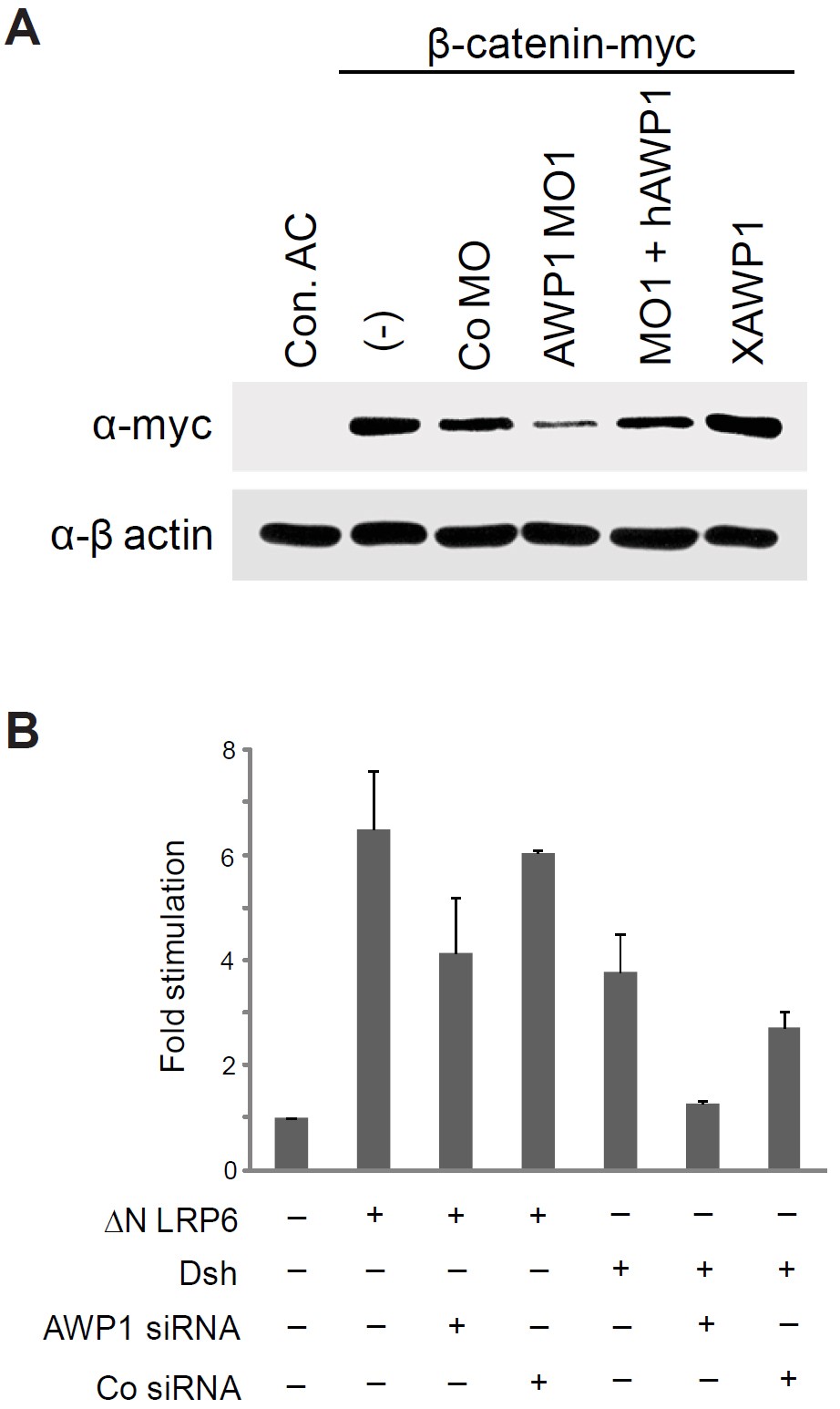 Fig. 6. AWP1 is involved in Wnt/-catenin signaling. (A) Four-cell stage