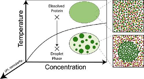 Figure 1. RNA/protein droplets. (A) Nucleoli (and other RNP droplets) within the nucleus of an X. laevis oocyte. Adapted from Brangwynne et al. (2011). (B) In vitro droplets formed from myelin basic protein (MBP). Adapted from Aggarwal et al. (2013). (C) In vitro droplets of fluorescently labeled multi-domain SH34/PRM4 proteins. Adapted with permission from Macmillan Publishers Ltd.: Nature (Li et al., 2012).
