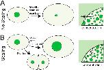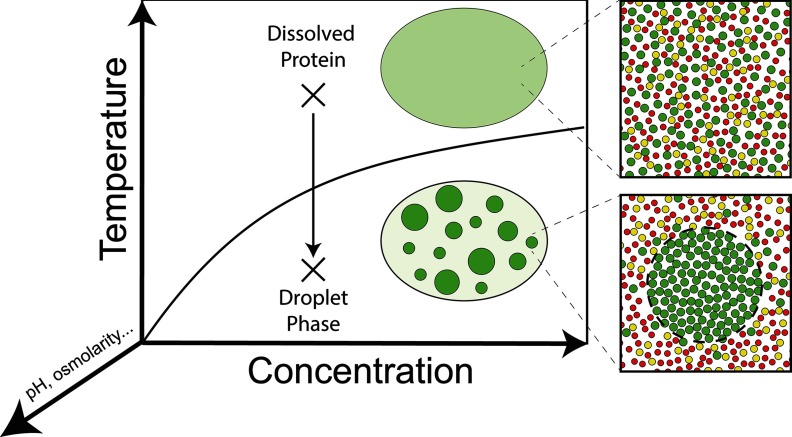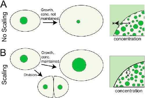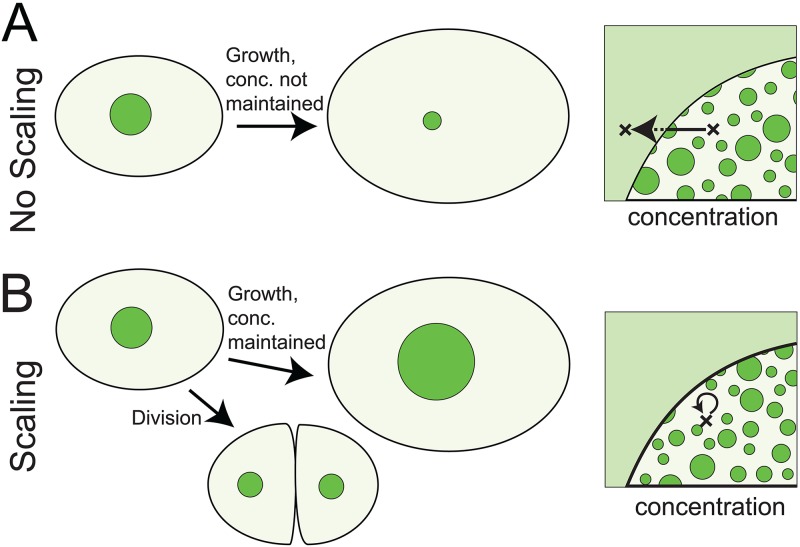 Figure 2. Phase transitions and size scaling. (A) Growth of a cell without the production of droplet component(s) will lead to decreased total component concentration (conc.), shifting the location within the phase diagram. In this case, a single nucleated droplet would dissolve (no scaling). (B) In a situation where cell size changes either through growth with a constant total component concentration or where cell size changes through division, the location in the phase diagram will not change, and the size of a single nucleated droplet will scale with cell size.