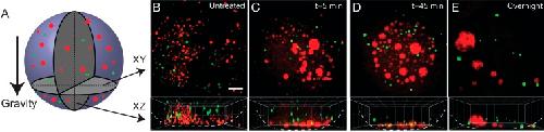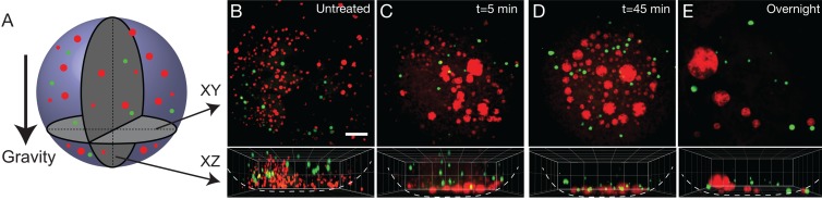 Figure 4. Gravity and large droplets in large cells. (A and B) An intact X. laevis oocyte nucleus (GV) contains hundreds of RNP droplets, including nucleoli (red) and histone locus bodies (green), distributed through the GV (XY projection shown in top panels, XZ projection shown in bottom panels). A nuclear actin scaffold keeps these droplets from fusing. Bar, 50 μm. (C and D) Upon actin disruption, nucleoli undergo gravitational sedimentation to the bottom of the nucleus, where they undergo massive fusion events, ultimately resulting in a few large droplets (E). Panels B–E adapted from Feric and Brangwynne (2013), copyright Nature Publishing Group.