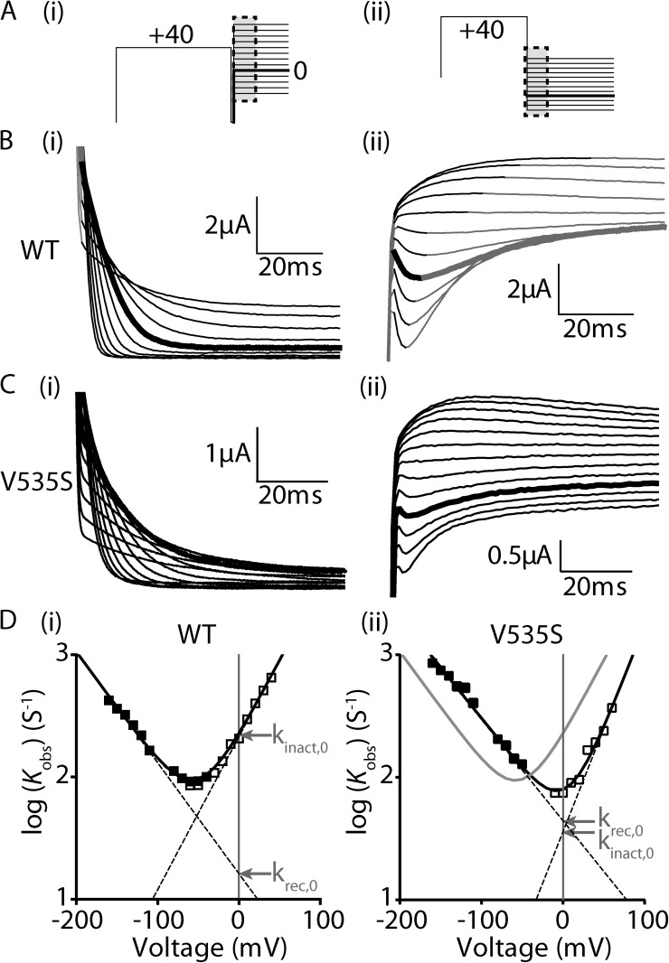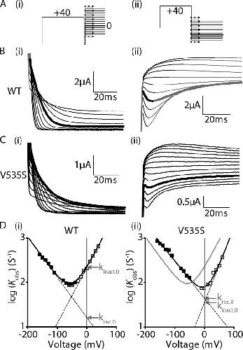 Figure 1. Measurement of inactivation kinetics for WT and V535S Kv11.1 channels. (A) Voltage protocols used to measure the rates of onset of inactivation (i) and the rates of recovery from inactivation (ii), with key regions for the measurement of current highlighted in black. (B and C) Representative families of current traces measuring the rates of onset of inactivation (i) and rates of recovery from inactivation (ii) for WT (B) and V535S (C) Kv11.1 channels. Highlighted in bold are current traces at 0 mV (i) and −130 mV (ii) to aid comparison. (D) Chevron plots of the logarithm of the observed rates for onset of (open squares) and recovery from (closed squares) inactivation for WT (i) and V535S (ii) channels, plotted against voltage. Solid black lines are a fit of Eq. 1 (see Materials and methods), whereas the solid gray line in (ii) indicates kobs,V for WT channels to aid comparison. Dashed lines indicate the derived unidirectional rate constants for the onset of (kinact,V) and recovery from (krec,V) inactivation, with values at 0 mV indicated by arrows. The equilibrium constant for inactivation (Keq) at 0 mV was calculated by: Keq,0 = kinact,0/krec,0 (Eq. 2 in Materials and methods). |