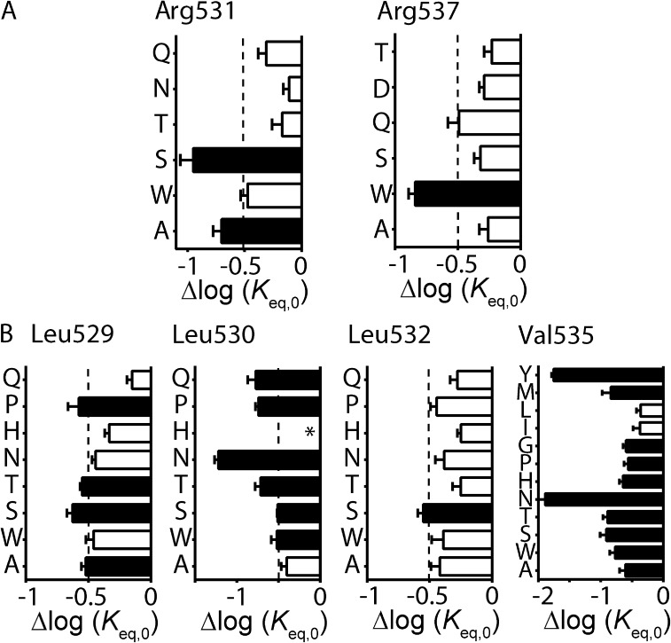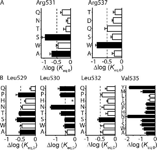 Figure 2. Scanning mutagenesis of the Kv11.1 channel S4 helix. (A–C) Shifts, relative to WT, in log(Keq,0) values for alanine (A), serine (B), and tryptophan (C) mutagenesis scans of S4 residues spanning from Gly522 to Lys538. Data are presented as means ± SEM for n = 3–20 cells (see Table S1). Dashed lines indicate Δlog(Keq,0) > ±0.5 log units, which has been shown previously to be the minimum perturbation required to derive an accurate Φ-value (Cymes et al., 2002; Wang et al., 2011). Mutations that fulfill this minimum requirement are indicated by closed bars, whereas mutations with Δlog(Keq,0) < 0.5 log units are indicated by open bars. *, mutant channels that failed to express or expressed poorly. |