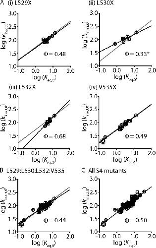 Figure 4. Mutation of S4 residues affects inactivation at a midway point during the transition pathway. (A) REFER plots of the log forward unidirectional rate constant, log(kinact,0), against the log equilibrium constant, log(Keq,0), for inactivation, in families of mutations at individual residues: i, Leu529; ii, Leu530; iii, Leu532; iv, Val535. (B and C) REFER plots for all mutations at Leu529, Leu530, Leu532, and Val535 combined (B) or all S4 residue mutations (C). Data are presented as means ± SEM for 3–14 cells. The slope of the linear regression analysis (solid black lines) for each family of mutations represents the Φ-value, as indicated, and can be compared with the slope for all other S4 mutations (solid gray lines). ANCOVA was used to determine statistical significance; *, P < 0.05. |