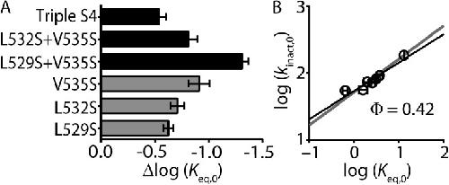 Figure 5. Combinations of S4 mutants do not have additive effects on the energetics of Kv11.1 channel inactivation. (A) Bar graph comparing shifts in log(Keq,0), relative to WT, for triple S4 mutant (L529S + L532S + V535S), double mutants L532S + V535S and L529S + V535S, and single mutants V535S, L532S, and L529S. Data are presented as means + SEM for 5–18 cells. (B) REFER plot of triple S4 mutant (L529S + L532S + V535S), double mutants L532S + V535S and L529S + V535S, and single mutants V535S, L532S, and L529S. Data are presented as means ± SEM for 5–18 cells. The linear slope (solid black line) indicates a Φ-value of 0.42 and was not significantly different to that derived from all of the individual S4 mutants (Φ = 0.50; P > 0.05 using ANCOVA). |