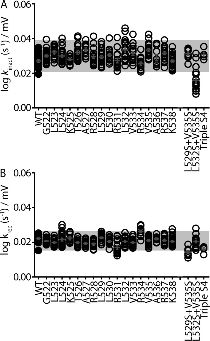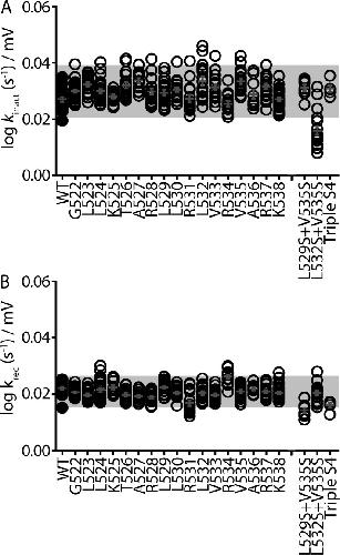 Figure 7. Only combinations of S4 mutants alter the voltage sensitivity of Kv11.1 channel inactivation. (A and B) Dot plots showing the linear slope values calculated from the derived unidirectional rate constants (shown as black lines in Fig. 1 D) for the onset of (kinact; A) and recovery from (krec; B) inactivation for groups of mutants (to Ala, Ser, and Trp) at each residue in the S4 domain, as well as the double and triple mutants. Slope values indicate the voltage dependence of the forward (inactivation; A) and reverse (recovery from inactivation; B) gating transitions. The mean of all mutations at each individual residue falls within ±2 standard deviations (gray box) of the mean calculated from all single S4 mutants. |