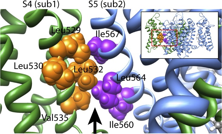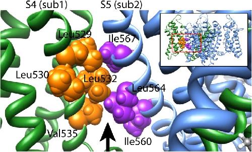 Figure 9. Homology model of the Kv11.1 channel. View parallel to the membrane of an amplified region of a Kv11.1 channel homology model created using the Kv1.2/2.1 chimera crystal structure (Long et al., 2007) as a template, according to the alignment shown in Fig. S3. The amplified region is indicated by the boxed region of the entire four-subunit homology model shown in the inset. Hydrophobic residues on the S4 helix (Leu529, Leu532, and Val535) of one subunit (sub1; shown in green, with residues colored orange) face toward hydrophobic residues on the S5 helix (Ile560, Leu564, and Ile567) of the neighboring subunit (sub2; shown in blue, with residues colored purple). The arrow represents a cavity filled by lipid in the Kv1.2/2.1 crystal structure. |