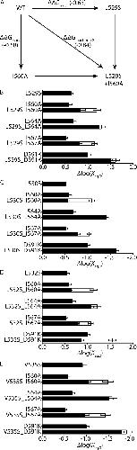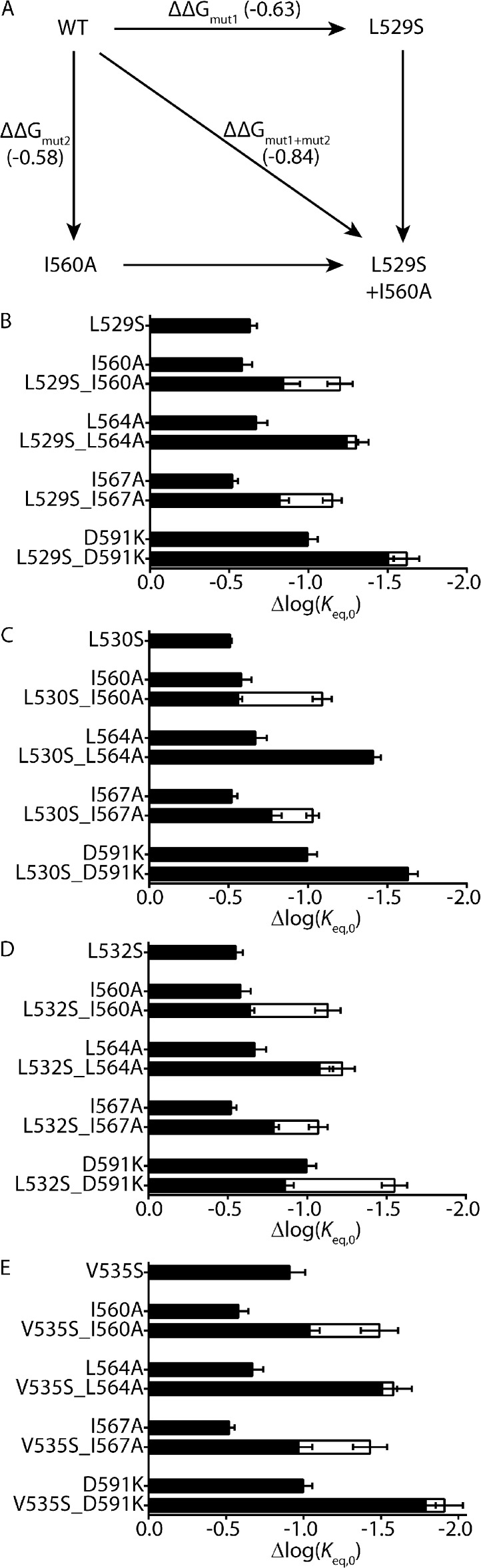Figure 10. Double mutant cycle analysis of S4 and S5 helix residues. (A) Schematic showing the principle of double mutant cycle analysis to test for an energetic coupling between Leu529 on the S4 helix and Ile560 on the S5 helix. Perturbations to inactivation, measured by changes in log(Keq,0) relative to WT, caused by individual mutations, L529S (ΔΔGmut1) and I560A (ΔΔGmut2), are compared with the perturbation caused by the double mutant L529S + I560A (ΔΔGmut1+mut2). Measured Δlog(Keq,0) values representing ΔΔGmut1, ΔΔGmut2, and ΔΔGmut1+mut2 are shown in parentheses. An energetic coupling between Leu529 (S4) and Ile560 (S5) residues is indicated by ΔΔGmut1+mut2 being significantly different from ΔΔGmut1 + ΔΔGmut2 (P < 0.05; see Materials and methods). (B–E) Double mutant cycle analysis for S4 helix mutations L529S (B), L530S (C), L532S (D), and V535S (E), paired with mutations on the S5 helix (I560A, L564A, or I567A) or S5P linker (D591K). Measured values of Δlog(Keq,0) for individual or double mutants are shown as closed bars, whereas the theoretical additive values, ΔΔGmut1 + ΔΔGmut2, are shown by open bars. Data presented as means ± SEM for 6–14 cells (see Table S1). |