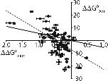 Figure 6. Perturbations to inactivation gating and activation gating show poor correlation for S4 residue mutations. Plot comparing perturbations to ΔG0, versus WT, of inactivation gating (ΔΔG0Inact, represented by Δlog(Keq,0)) compared with perturbations to ΔG0, versus WT, of activation gating (ΔΔG0Activ; see Materials and methods) for each S4 residue mutation. Solid black line represents linear regression analysis constrained to go through WT, whereas dashed gray line is an unconstrained fit (R2 = 0.38). |