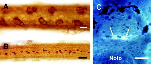 The neural plate is induced during gastrulation when the organizer affects the ectoderm around it. Recent experiments show that axial mesoderm can stimulate formation of specific ventral cell types in the spinal cord, including floor plate, motor neurons, and several types of interneurons. We have eliminated or disrupted axial mesoderm by using a variety of methods to show that ventral columns of intermittent dopaminergic neurons in the frog Xenopus also appear to be induced by axial mesoderm. Inversion of the dorsal-ventral neural axis by splitting the presumptive neural plate in vivo, produced two spinal cords with ectopic dopaminergic neurons. The location and number of neurons suggest that even a brief association with axial mesoderm can specify the identity of the first or primary dopaminergic neurons and that notochord retains the ability to induce cells to become secondary dopaminergic neurons.