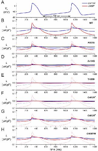 Figure 3. Effect of mutations in HCN4 on If in a human SAN pacemaker cell assessed by simulated action potential clamp. (A) Action potentials recorded from a human SAN pacemaker cell used for action potential clamp; (B) computed wild-type (WT) If of a human SAN pacemaker cell during the action potentials of (A) under control conditions (“control”, blue line) and upon adrenergic stimulation (“cAMP”, red line); (C–H) computed If of a human SAN pacemaker cell carrying heterozygous mutation in HCN4, as indicated, during the action potentials of (A) under control conditions (solid blue line) and upon adrenergic stimulation (solid red line). Wild-type If of (B) under control conditions (dashed blue line) and upon adrenergic stimulation (dashed red line) are shown for reference. G482R traces, labelled “a” and “b”, are based on data from Milano et al. [27] and Schweizer et al. [28], respectively.