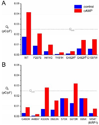 Figure 4. Contribution of If to diastolic depolarization for each of the heterozygous mutations in HCN4 or KCNE2. The charge carried by If (Qf) during the 25-mV, 550-ms spontaneous depolarization from the maximum diastolic potential of −63 mV of the human SAN action potential is as indicated in Figure 3A. The blue bars are computed from the If traces under control conditions (“control”). The red bars are computed from the If traces upon adrenergic stimulation (“cAMP”). The dashed grey line indicates the charge of 0.025 pC/pF carried by the net membrane current (Qnet) during the 25-mV depolarization. (A) Mutations of Figure 3; (B) mutations assessed in previous publication [30].