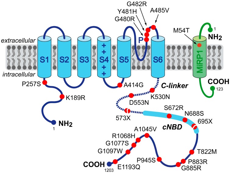 Figure 1. Schematic topology of the HCN4 and MiRP1 proteins. The HCN4 α-subunit has six transmembrane segments (S1–S6), a pore-forming loop (P) and intracellular N- and C-termini. The voltage sensor of the channel is formed by the positively-charged S4 helix. The C-terminus comprises the C-linker (dotted line) and the cyclic nucleotide-binding domain (cNBD), which is known to mediate cyclic AMP (cAMP)-dependent changes in HCN channel gating. The MiRP1 β-subunit has a single transmembrane segment with an extracellular N-terminus and intracellular C-terminus. Red dots indicate the location of the 23 known HCN4 and MiRP1 mutation sites associated with clinically established or potential sinus node dysfunction. The split dots indicate the truncations resulting from the 573X and 695X non-sense (truncating) mutations.