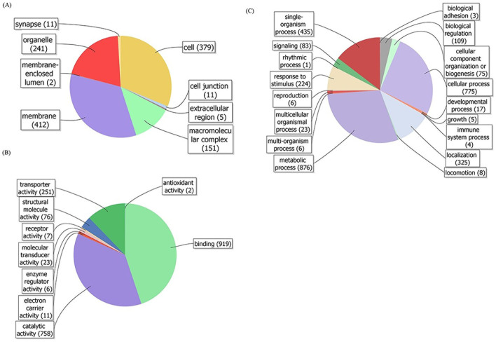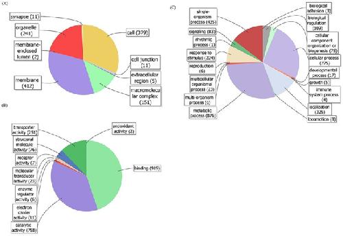 Figure 1. GO classification of identified proteins after Mascot search.Pie chart presentation of GO annotation was generated automatically by the web tool Blast2GO (http://www.blast2go.com/b2ghome) using the newest GO archive provided. The identified proteins were classified at the second level under three root GO domains: (A) cellular component, (B) molecular function and (C) biological process. For some cases, one identified proteins could be annotated into more than one GO term.
