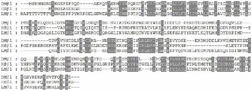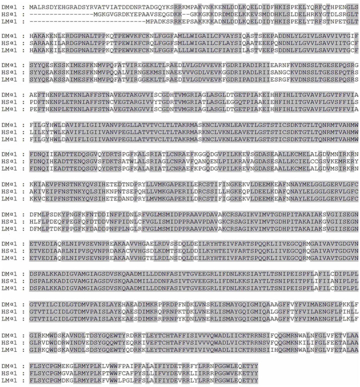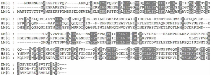Figure 3. Alignment of amino acid sequences of Na+/K+ ATPase β1 subunit of D. melanogaster (DM, NP_477167), H. sapiens (HS, NP_001668) and L. migratoria