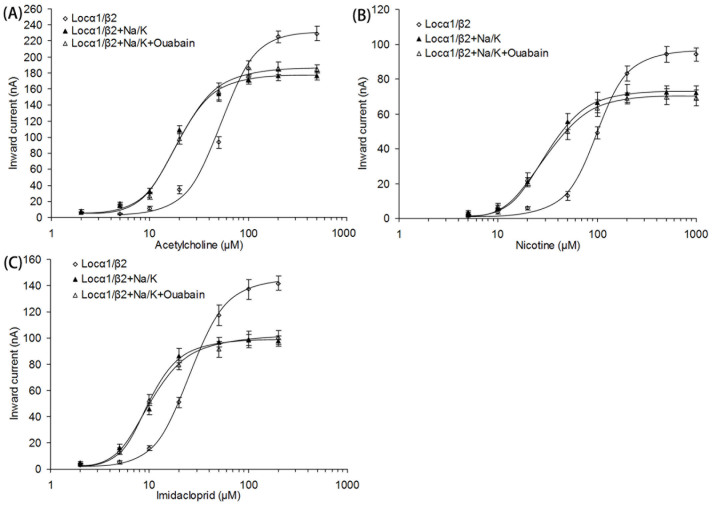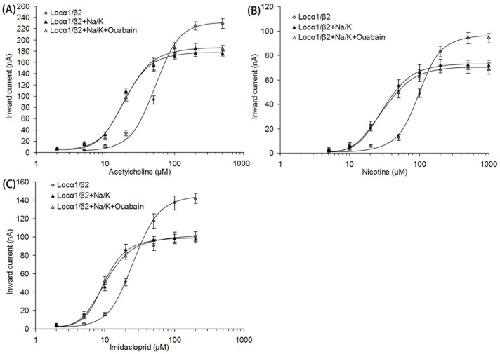 Figure 5. Effects of Na+/K+ ATPase on agonist sensitivities of nAChRs.(A) Does-response curves for acetylcholine. (B) Does-response curves for nicotine. (C) Does-response curves for imidacloprid. The curves from the oocytes expressing nAChRs (L. migratoria manilensis subunit α1 and R. norvegicus subunit β2) were indicated by open squares. The curves from the oocytes co-expressing nAChRs and Na+/K+ ATPase (subunit α1 and β1) were indicated by solid triangles (without ouabain) and open triangles (with ouabain).