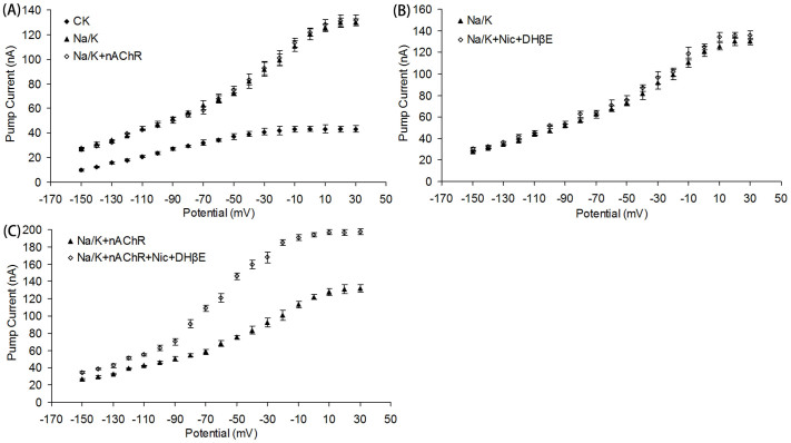 Figure 4. Effect of co-expressed nAChRs on pump currents of Na+/K+ ATPase.(A) Endogenous pump current of Xenopus oocytes as control (CK, solid squares), oocytes expressing Na+/K+ ATPase (solid triangles) and oocytes co-expressing Na+/K+ ATPase and nAChRs (open squares). (B) Pump currents of oocytes expressing Na+/K+ ATPase before (solid triangles) and after (open squares) the activation by 1 μM nicotine and 1 μM DHβE. (C) Pump currents of oocytes co-expressing Na+/K+ ATPase and nAChRs before (solid triangles) and after (open squares) the activation by 1 μM nicotine and 1 μM DHβE.