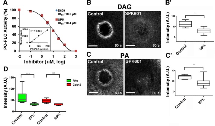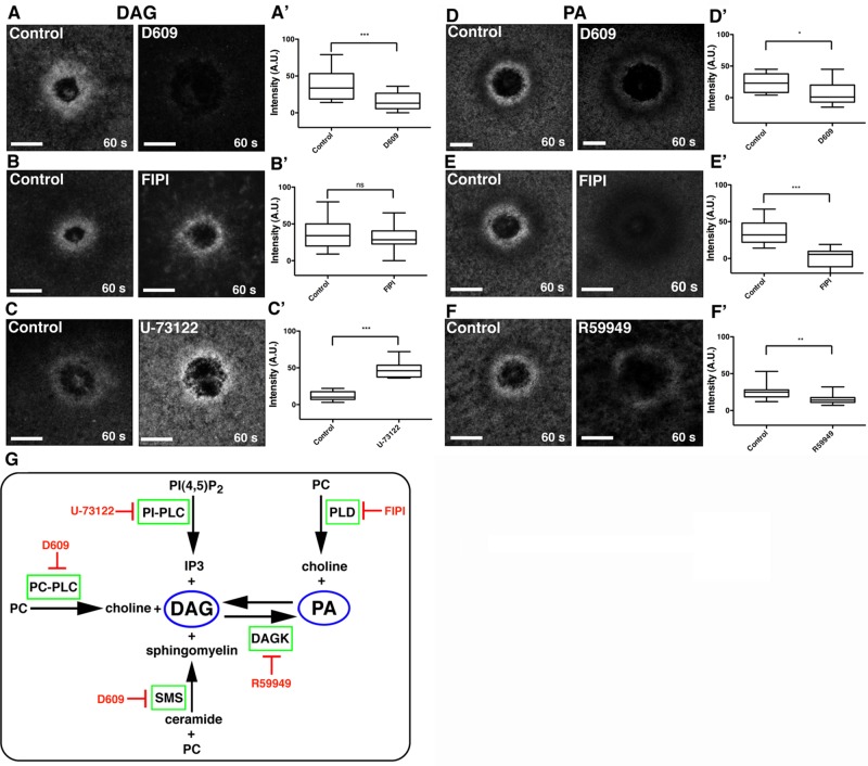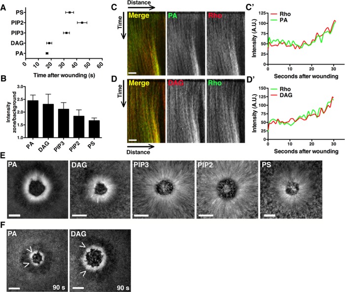 After damage, cells reseal their plasma membrane and repair the underlying cortical cytoskeleton. Although many different proteins have been implicated in cell repair, the potential role of specific lipids has not been explored. Here we report that cell damage elicits rapid formation of spatially organized lipid domains around the damage site, with different lipids concentrated in different domains as a result of both de novo synthesis and transport. One of these lipids-diacylglycerol (DAG)-rapidly accumulates in a broad domain that overlaps the zones of active Rho and Cdc42, GTPases that regulate repair of the cortical cytoskeleton. Formation of the DAG domain is required for Cdc42 and Rho activation and healing. Two DAG targets, protein kinase C (PKC) β and η, are recruited to cell wounds and play mutually antagonistic roles in the healing process: PKCβ participates in Rho and Cdc42 activation, whereas PKCη inhibits Rho and Cdc42 activation. The results reveal an unexpected diversity in subcellular lipid domains and the importance of such domains for a basic cellular process.
