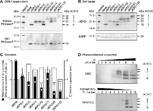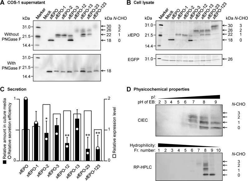 Fig 2. Expression, secretion, and physicochemical properties of N-glycosylated xlEPO muteins.(A) Western blot analysis of xlEPO muteins secreted from COS-1 cells. Conditioned media were concentrated 10-fold (top panel), and subjected to PNGase F treatment (bottom panel). Wild-type xlEPO and N-glycosylated muteins were separated by SDS-PAGE (reducing conditions) and visualized by Western blot analysis. Equal volumes of samples were loaded into each lane. (B) Western blot analysis of xlEPO muteins remaining in COS-1 cells. Whole-cell lysates were loaded into each lane. xlEPO (top panel) and EGFP (bottom panel) were visualized by Western blot analysis. Co-expressed nonsecretory EGFP was used as a loading control. (A, B) Standard proteins are shown at the far left, and the letters above each lane represent the names of the muteins shown in Fig 1. (C) Effects of N-glycosylation on the secretion of xlEPO muteins. The relative amounts of xlEPO muteins in the culture media of COS-1 cells were measured by densitometry analysis of Western blots (filled bars). The relative expression levels were calculated based on the fluorescence intensity of co-expressed EGFP (open bars). The relative efficiency of secretion was obtained by the division of relative amount by relative expression level (open circles). Values were normalized to that of the wild type, which was set at 1. *p < 0.05 and **p < 0.01 compared to the wild type. (D) Physicochemical properties of xlEPO muteins. Cation-exchange chromatography (CIEC, top panel) and the reverse-phase high-pressure liquid chromatography (RP-HPLC, bottom panel) of wild-type xlEPO and N-glycosylated muteins were performed as described in the Materials and methods section. The collected fractions were subjected to Western blot analysis. ‘N-CHO’ indicates the number of N-linked carbohydrates. Abbreviations are: EB, elution buffer; Fr., fraction.