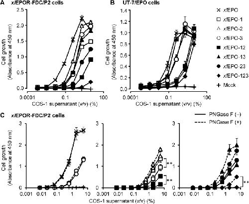 Fig 3. Effects of wild-type xlEPO and the glycosylated muteins on the proliferation of X. laevis and human EPOR-expressing cells.(A, B) The proliferative responses of xlEPOR-FDC/P2 cells (A) and UT-7/EPO cells (B) to the wild-type xlEPO and the N-glycosylated muteins were assessed using the MTS assay. Incubations were performed in triplicate, and the results are presented as the mean (± SD) from 1 of 4 independent experiments. (C) The proliferative responses of xlEPOR-FDC/P2 cells to wild-type xlEPO and the N-glycosylated muteins treated with (dashed line) and without (solid line) PNGase F were also assessed. The PNGase F-treated samples are the same fractions displayed in Fig 2A, bottom panel. Incubations were performed in triplicate, and the results are presented as the mean (± SD) from 1 of 3 independent experiments. **p < 0.01 for the comparison. Symbols are: multiple marks, wild-type xlEPO; open squares, xlEPO-1; open triangles, xlEPO-2; open circles, xlEPO-3; closed squares, xlEPO-12; closed triangles, xlEPO-13; closed circles, xlEPO-23; closed rhombuses, xlEPO-123; plus sign, Mock (control culture supernatant without xlEPO).