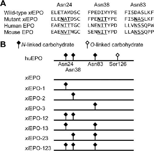 Fig 1. Design of N-glycosylated xlEPO muteins.(A) Schematic drawings of Xenopus laevis erythropoietin (xlEPO) muteins. N- and O-glycosylation sites are indicated by closed and opened rhombuses, respectively. The terms to the left of the bars represent the names of the muteins. âXâ in xlEPO-XXX indicates N-glycosylation positions (1, Asn24; 2, Asn38; 3, Asn83). (B) Amino acid sequences around the introduced N-glycosylation sites in the xlEPO muteins. The parallel sequences of wild-type xlEPO, human EPO, and mouse EPO are also shown. Consensus sequences for N-glycosylation (Asn-Xxx-Ser/Thr) are underlined, with the amino acid substitutions in bold.