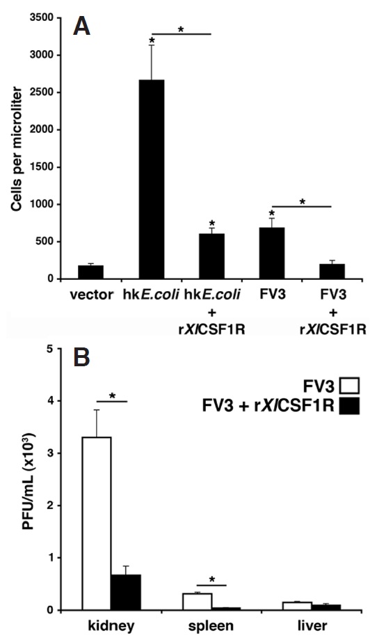 Macrophage-lineage cells are indispensable to vertebrate homeostasis and immunity. In turn, macrophage development is largely regulated through colony-stimulating factor-1 (CSF1) binding to its cognate receptor (CSF1R). To study amphibian monopoiesis, we identified and characterized the X. laevis CSF1R cDNA transcript. Quantitative analysis revealed that CSF1R tissue gene expression increased with X. laevis development, with greatest transcript levels detected in the adult lung, spleen and liver tissues. Notably, considerable levels of CSF1R mRNA were also detected in the regressing tails of metamorphosing animals, suggesting macrophage involvement in this process, and in the adult bone marrow; corroborating the roles for this organ in Xenopus monopoiesis. Following animal infections with the ranavirus Frog Virus 3 (FV3), both tadpole and adult X. laevis exhibited increased kidney CSF1R gene expression. Conversely, while FV3-infected tadpoles increased their spleen and liver CSF1R mRNA levels, the FV3-challenged adults did not. Notably, FV3 induced elevated bone marrow CSF1R expression, and while stimulation of tadpoles with heat-killed E. coli had no transcriptional effects, bacterial stimulation of adult frogs resulted in significantly increased spleen, liver and bone marrow CSF1R expression. We produced the X. laevis CSF1R in recombinant form (rXlCSF1R) and determined, via in vitro cross-linking studies, that two molecules of rXlCSF1R bound the dimeric rXlCSF1. Finally, administration of rXlCSF1R abrogated the rXlCSF1-induced tadpole macrophage recruitment and differentiation as well as bacterial and FV3-elicited peritoneal leukocyte accumulation. This work marks a step towards garnering greater understanding of the unique mechanisms governing amphibian macrophage biology.