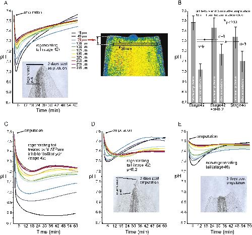 A) Typical dynamics of mean pH value changes as measured in ten transverse rectangular frames before amputation and during one hour after it (see the Materials and Methods section for details). Each of the dynamics curves is marked by a specific color, beginning with the black color, which is assigned to the frame nearest to the amputation edge. The position of each frame from the amputation edge to the middle of the frame is indicated in microns. Inset image shows the tip of the same regenerating tail 3 days following amputation. An example of the amputated tail in pseudocolors corresponding to SypHer-2 ratio, with one measuring frame located 75 μm from the amputation edge is shown on the right. Note that the blue color on the sides of the tail is a specific characteristic of this particular tail in which the injected SypHer-2 mRNA is absent in cells of the lateral sides of the tail. Due to a low auto-fluorescence of the tail tissues the ratio of fluorescence intensities in the lateral regions appears to be different from zero and appears as a constant blue pseudocolor. Notably, the auto-fluorescence intensity is more than 10-fold lower than the intensity of signal generated even by a low amount of SypHer-2. B) Mean value of pH near the amputation edge (measuring frame with the median at 15 μm from the edge) before amputation and in the minimum of pH dynamics curve of stage 42 tails (left pair of bars), stage 42 tails of tadpoles treated by pH 8.2 solution for 2 h before amputation (middle pair of bars) and stage 46 tails (right pair of bars). Standard deviation is indicated for each bar. The numbers show total number of tails in which pH was measured at the level of 15 μm from the amputation edge before and after amputation. C) representative dynamics of mean pH value measured as described in A, but in tails of stage 42 tadpoles treated with a V-ATPase inhibitor bafilomycin (200 nM for 1 h before amputation). D) Representative dynamics of mean pH value measured as described in A, but in tails of stage 42 tadpoles treated by pH 8.2 solution for 2 h before amputation. Inset image shows tip of the same tail after 3 days of amputation. E) Representative dynamics of mean pH value measured as described in A, but in tails of stage 46 tadpoles. Inset image shows tip of the same tail after 3 days of amputation.