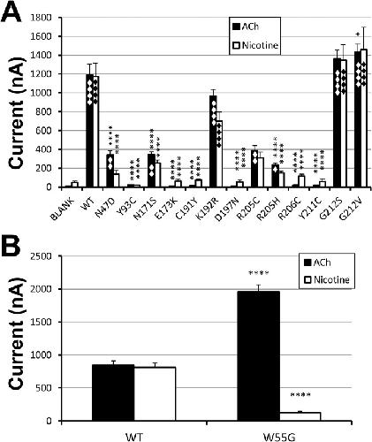 Fig 2. Current responses of the wild type and mutant receptors to 3.16mM ACh or nicotine with non-injected oocyte controls.A. 13 mutants and wild type control along with un-injected oocyte control (for nonfunctional mutants). The same amount of cRNAs for the wild type or mutant receptors was injected. On the 3rd post-injection day, the oocytes were tested with ACh (with 1 μM atropine) or nicotine. The name of each condition is indicated at the bottom of each bar. Each group had 8–18 oocytes from two sets of experiments. Asterisk (*, **, or ****) represents that the difference between the wild type and each mutant is statistically significant (P<0.05, P<0.01, or P<0.0001) in Tukey multiple comparison test of one-way ANOVA. ♦, ♦♦ or ♦♦♦♦ represent the statistical difference with P<0.05, P<0.01, or P<0.0001 between blank and each mutant. B. W55G mutant and its wild type control in a separate experiment (10 oocytes each group). ****: P<0.0001 with 2-sided grouped t-test.