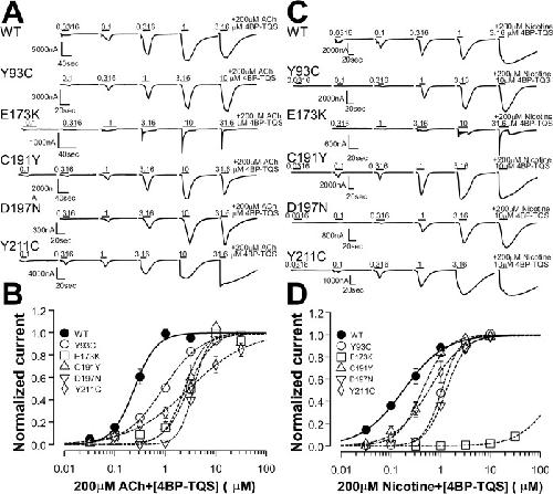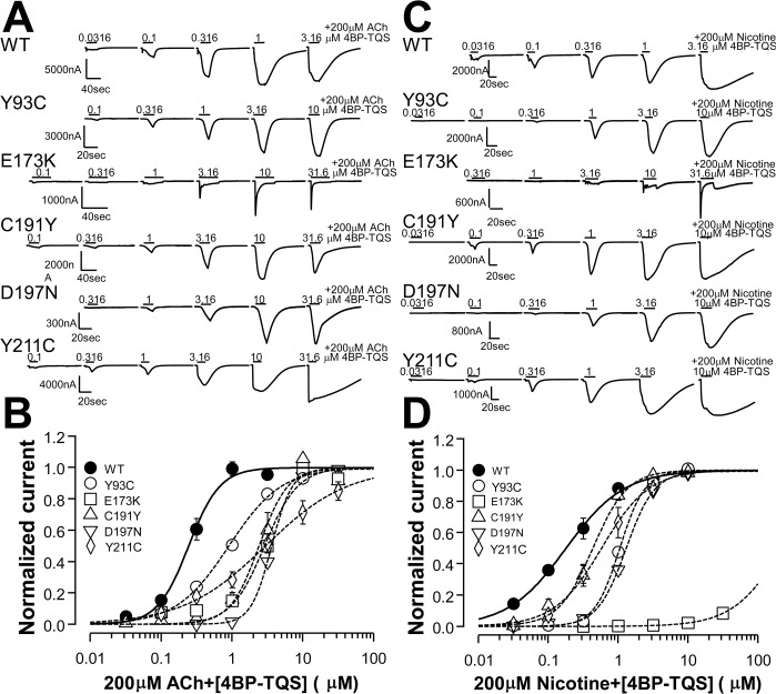 Fig 8. 4BP-TQS concentration-response for the rescued nonfunctional mutants with a fixed ACh or nicotine concentration.A. Representative current traces induced by increasing concentration of 4BP-TQS in the presence of 200 μM ACh. B. Normalized and averaged (each group had 5–6 oocytes) current responses from A. Lines are nonlinear least squares fits of the normalized averages of the responses to the Hill equation. The derived EC50 values from individual fits are listed in Table 3. C. Representative current traces induced by increasing concentration of 4BP-TQS in the presence of 200 μM nicotine. D. Normalized and averaged current responses (each group had 5–6 oocytes) from C. The derived EC50 values from individual fits are listed in Table 3.