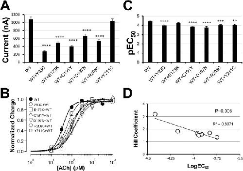 Fig 9. Coexpression of wild type and nonfunctional mutant.The same amount of cRNAs encoding the wild type or wild type plus mutant (in 1:1 ratio) were injected into Xenopus oocytes, and recorded with two electrode voltage clamp for ACh-induced current after 3 days of injection. A. Peak current induced by 3.16mM ACh for all groups on the 3 post-injection day. ****: P<0.0001. Each group had at least 16 oocytes. B. Averaged concentration response relationships of the wild type and wild type plus mutant as indicated. Each group is the average of six oocyte data. C. EC50 values were derived by fitting individual concentration-response curves in B. pEC50 values (negative logEC50) are used to plot the data. (**, “***”, “****”: p<0.01, P<0.001, or P<0.0001). D. Linear regression analysis for the relationship between Hill slope and LogEC50.