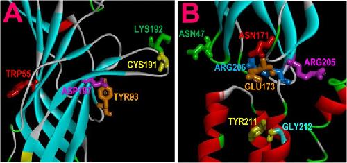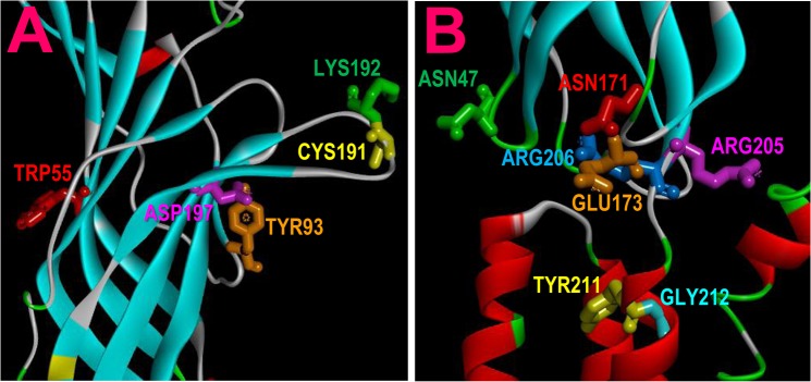 Fig 1. Location of 14 mutations in the α7 nAChR receptor.A: The residues with the mutations in the binding region (loops A (TYR93), and C (CYS191, LYS192, ASP197) of the principal side of a binding pocket, and D (TRP55) of the complementary side of the neighboring binding pocket); B, The residues with the mutations in the coupling region (loop 2 (ASN47), loop 9 (ASN171 and GLU173), pre-M1 (ARG205 and ARG206) and M1 (TYR211 and GLY212).