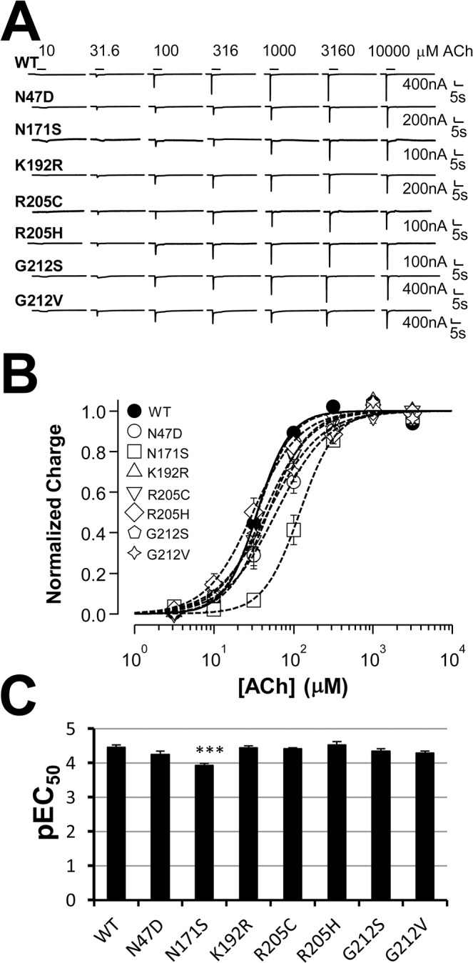 Fig 3. ACh concentration-response for most of the functional mutants.A. Representative current traces induced by ACh for the wild type and mutant receptors with the concentrations indicated. B. Averaged and normalized concentration-responses of charge (6–8 oocytes each group). Lines are nonlinear least squares fits of the normalized averages of the responses to the Hill equation. C. Bar graph of the pEC50 values (negative logEC50s) derived from B. ***: P<0.001 when compared to the WT value.