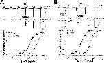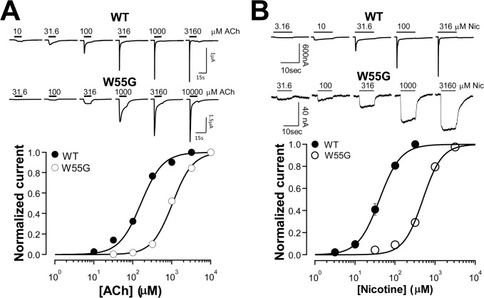 Fig 4. Concentration-responses of W55G mutant to ACh and nicotine.A. Concentration responses of the wild type and W55G to ACh. Top: raw current traces; bottom: normalized and averaged currents. Lines are least-squares fit of the data to the Hill equation. The resulting EC50 for ACh in the wild type receptor was 210.5±24.3 μM, and the EC50 for W55G mutant was 1375.3±130.5 μM (N = 5). B. Concentration responses of the wild type and W55G to nicotine. Top: raw current traces; bottom: normalized and averaged currents. Lines are least-squares fit of the data to the Hill equation. The resulting EC50 values for nicotine were 43.6±4.8 μM and 530.40±12.91 μM for the wild type and mutant receptor respectively (N = 5).
