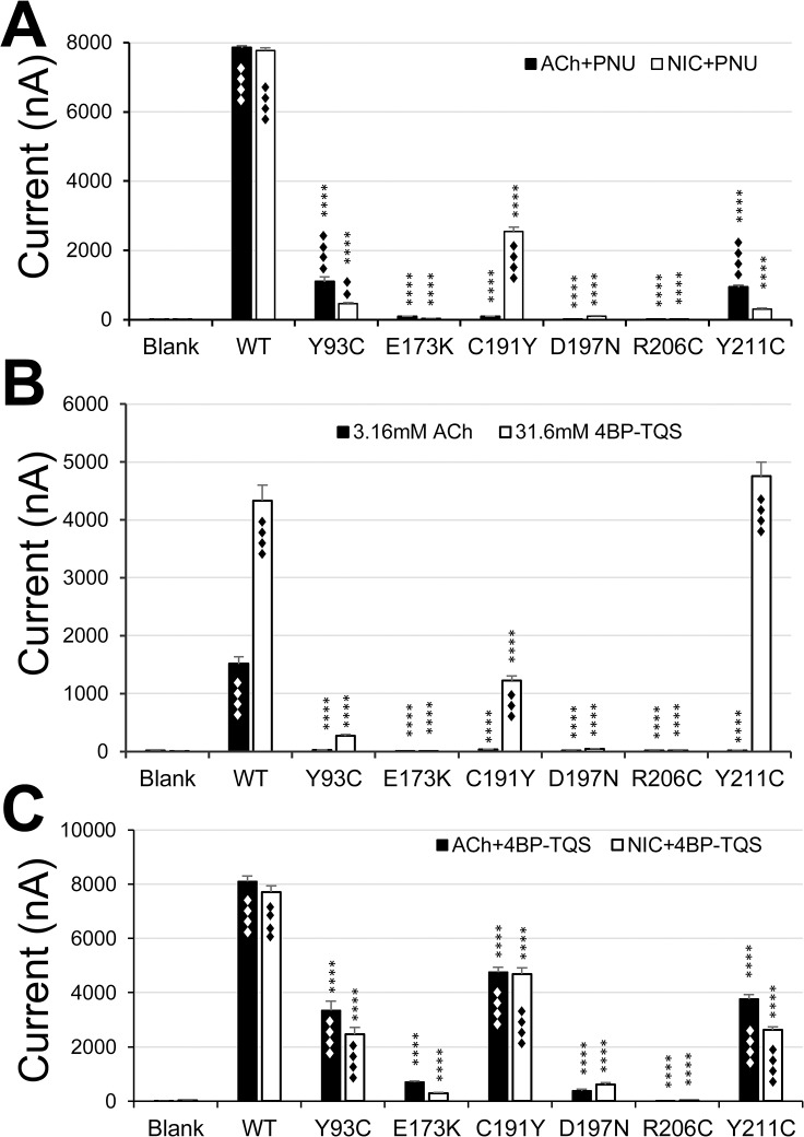 Fig 5. Agonist-responses for the nonfunctional mutants in the presence of a PAM or agonist-PAM.A. Co-application of 31.6 μM PNU-120596 with 200 μM ACh or nicotine rescued the receptor functions for some of the nonfunctional mutants. The same amount of cRNA was injected for each group, and recordings were performed after 3 days in 9–19 oocytes for each group). The bar graph represents the average currents rescued by PNU-120596. In case of the wild type, the current represents the rescued current from desensitization. B, Direct activation of nonfunctional mutants by 4BP-TQS. The same amount of cRNA was injected for each group, and recordings were performed after 3 days in 10–17 oocytes in each group). C, Co-application of 4BP-TQS with ACh or nicotine rescued more mutants. The same amount of cRNA was injected for each group, and recordings were performed after 3 days in 9–19 oocytes in each group. Asterisk (****) represents that the difference between the wild type and each mutant is statistically significant (P<0.0001) in Tukey multiple comparison test of one-way ANOVA. ♦♦, ♦♦♦, or ♦♦♦♦ represent the difference between blank and each mutant with statistical significance (P<0.01, P<0.001, or P<0.0001).