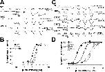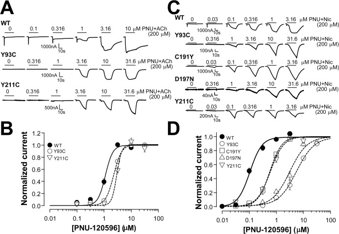 Fig 6. PNU120596 concentration-response for the rescued nonfunctional mutants with a fixed ACh or nicotine concentration.A. Representative current traces induced by increasing concentration of PNU-120596 in the presence of 200 μM ACh. B. Normalized and averaged (each group had at least 6 oocytes) current responses to ACh from A. Lines are nonlinear least squares fits of the normalized averages of the responses to the Hill equation. The derived EC50 values from individual fits are listed in Table 2. C. Representative current traces induced by increasing concentration of PNU-120596 in the presence of 200 μM nicotine. D. Normalized and averaged current responses (each group had at least 6 oocytes) to ACh from C. The derived EC50 values from individual fits are listed in Table 2.