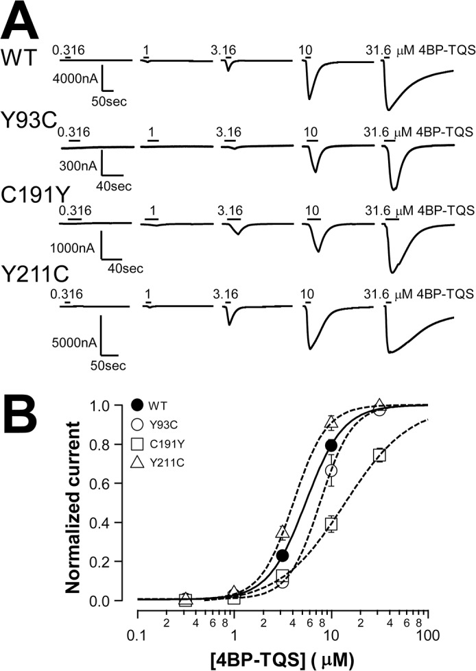 Fig 7. Concentration response of 4BP-TQS direct activation of the wild type control and Y93C, C191Y, and Y211C mutants.A, Representative current traces induced by increasing concentration of 4BP-TQS. B. Normalized and averaged current responses to 4BP-TQS from A. Lines are nonlinear least squares fits of the normalized averages of the responses to the Hill equation. The resulting EC50 values were 5.54±0.31, 8.21±1.03, 13.73±1.73, and 4.23±0.30 μM for the wild type control and Y93C, C191Y, and Y211C mutants respectively (n = 6 for each group).