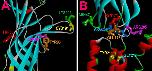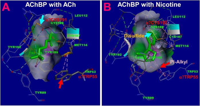Fig 10. Different interactions of ACh and nicotine with the AChBP binding residues.A. The binding pocket between chain A and chain B of the AChBP co-crystalized with ACh (PBDID: 3WIP); B. The binding pocket between chain A and chain B of the AChBP co-crystalized with nicotine (PBDID: 1UW6). The residues of Cys191 and Trp55 in the human α7nAChR are labeled next to their homologous residues in the AChBP. Arrows indicate different interactions.