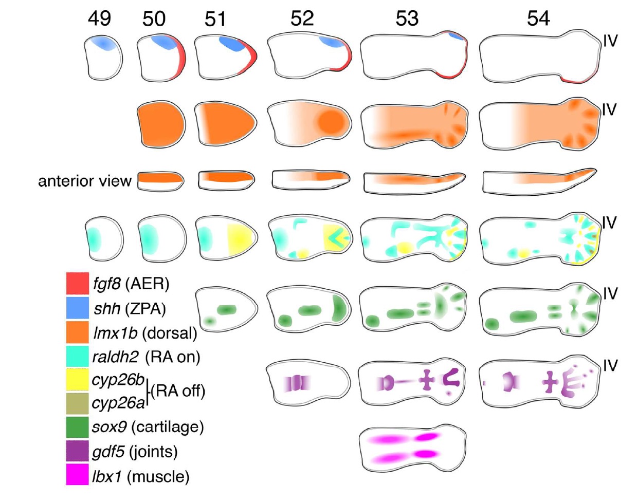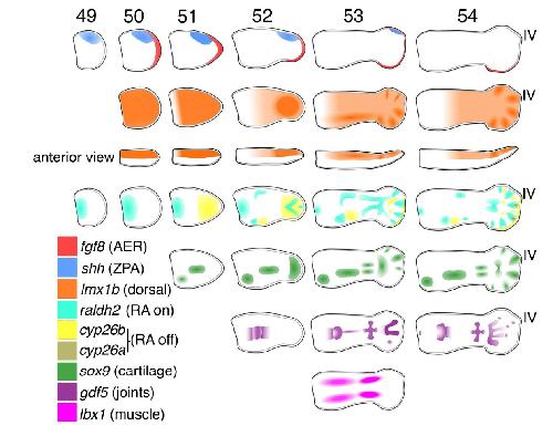 Genes referenced: aldh1a2 cyp26a1 cyp26b1 fgf8 gdf5 itk kcnt1 lbx1 lmx1b lmx1b.2 shh sox9 tbx2 zp2
