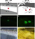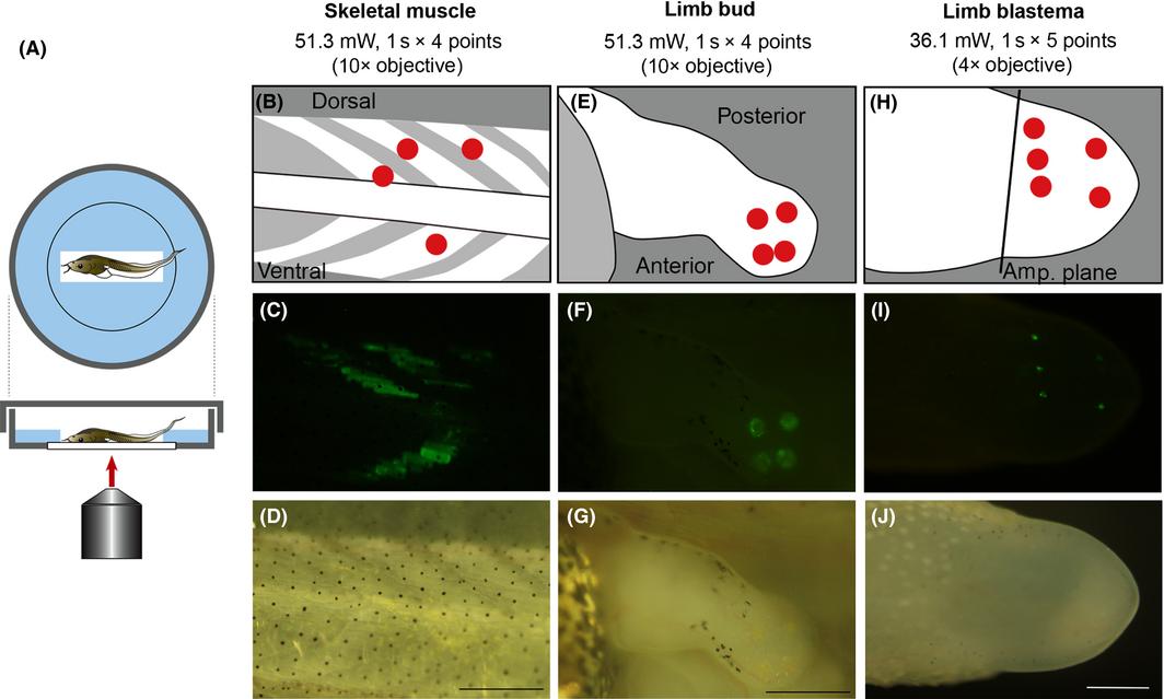 Infrared laser irradiation (IR-LEGO) operation in Xenopus laevis. (A) Schematic diagram of IR laser irradiation to a transgenic animal. The IR laser was irradiated through the objective lens of an inverted microscope. An anesthetized Dkk1GFP F1 Tg animal is put in the slit of agarose gel on a glass-bottom dish. The upper panels (B, E, H) show the irradiated areas marked by red circles. The middle panels (C, F, I) are fluorescent images and the lower panels (D, G, J) are bright field images. (B) Skeletal muscles in the tail of a tadpole at stage 54 were irradiated. (C, D) Pictures were taken 18 h after irradiation. (E) A lefthindlimb bud of a tadpole at stage 54 was irradiated from the dorsal side. (F, G) Pictures were taken 18 h after irradiation. (H) A forelimbblastema was irradiated from the ventral side at 11 dpa (days post amputation). (I, J) Pictures were taken 18 h after irradiation. (C, D, F, G) Scale bar = 500 μm; (I, J) Scale bar = 200 μm.